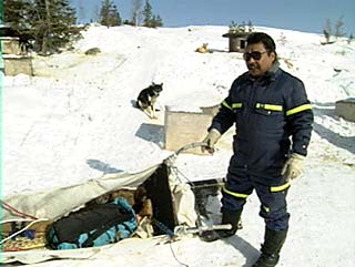 Fred Sangris is a Native American of the Dene nation. His family's diet depends on fish and game that he captures in the wild. During winter he hunts with a dog team and toboggan. Although motorized sleds may be faster and require no feeding, Fred points out that the dogs are endowed with keen sense of direction, and they are not subject to mechanical breakdowns. | |