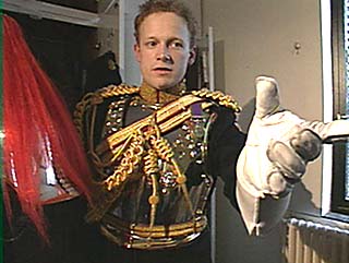 Captain William Bagnell is a soldier in Her Majesty's Household Guard. Duties of a cavalry officer include exercising the horses every morning at dawn. For this detail he dresses in khaki. A typical day in the life of Captain Bagnell requires four changes of uniform. | |